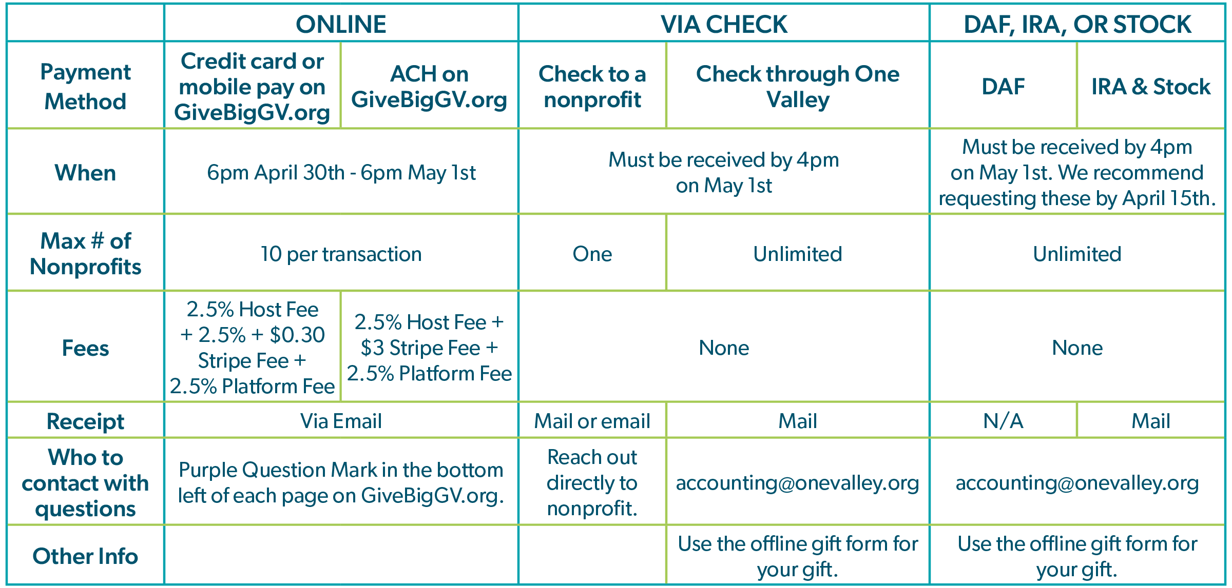 You can give by check in two ways: directly to a nonprofit or through One Valley Community Foundation if you want to support more than one organization with one check.